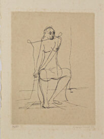 Gravura apresentada navertical. Possui uma figura humana sentada de frente e olhando para a sua esquerda, os braços esticados e tocando sua perna direita. Obs.: tiragem 32/80. No verso da obra possui as seguintes inscrições: Na parte superiror esquerdo: "MEP-99/01.3/0031-BC" ; "MULHER SENTADA" ; " CLOVIS GRACIANO" ; "GRAVURA CALCOGRAFIA" ; "24x18 - ?". Na parte inferior: "mulher sentada 6020 105.850.9".