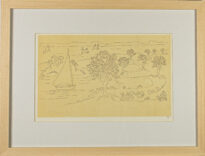 Gravura apresentada na horizontal com fundo amarelo. Na profundidade que a gravura demonstra, em primeiro plano possui um rio que da direita para a esquerda se forma de maneira sinuosa, há um barco à vela com a forma de uma pessoa em seu interior na parte esquerda; ainda no primeiro plano, do centro à direita possui uma árvore e diversas flores ao seu redor. Ao fundo há mais vegetações de árvores e palmeiras que acompanham as margens do rio; na parte superior esquerda possui três aves que voam em direção ao barco, e ainda linhas curvas que delineam morros. Obs.: assinatura no lado inferior direito: "T.". No verso da obra possui as seguintes inscrições: na partes superior esquerdo: "MEP-99/01.3/0054-BC" ; "Marinha" ; "Artes Visuais - Gravura" ; "Tarsila do Amaral" ; "Calcografia 26 x 39". Na parte inferior esquerdo: "548 106 971-9 C-4040/7".