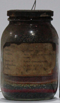 Pote de vidro com purpurina em camadas nas cores vermelho, verde, dourado, laranja azul. Obs.: fez parte de uma instalação de mesmo nome da Galeria Macunaíma da FUNARTE, conforme informação no site do artista, mas que continha várias unidades de potes de vidro com purpurina que ficavam pendurados