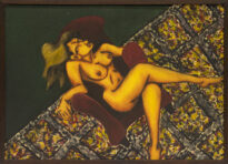 Pintura em cores no modo horizontal. Há uma figura humana feminina nua sentada de pernas cruzadas e cabelo loiro em uma poltrona vermelha