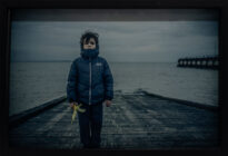 Fotografia digital em cores apresentada no modo horizontal, em primeiro plano há uma figura humana infantil que traja calça, casaco com capuz e sapatos de tons escuros, segura uma banana em sua mão direita, e está posicionada de frente para o observador em uma rampa de madeira que finaliza em um rio