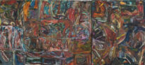 O díptico é preenchido por uma grande quantidade de formas irregulares, sobrepostas e entrelaçadas. As pinceladas são largas em diferentes direções. Com cores em tons de vermelho, marrom, verde, azul, laranja e roxo.