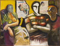 Pintura em cores no modo horizontal. No lado esquerdo há uma figura semelhante a uma figura feminina, sentada e com os seios de fora e o rosto pintado de azul e verde. No centro há uma figura semelhante a humana, com os braços cruzados, parte do seu rosto é uma colagem de página de livro e adesivo. No lado direito há uma figura semelhante a humana nas cores ocre, vermelho e preto. Nos cantos superior e inferior mais à esquerda há colagem de folha de revista, adesivo e jornal