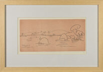Gravura apresentada na horizontal em papel rosado. Em primeiro plano possui linhas sinuosas que compõem um rio com algumas linhas curvas de formato côncavo que podem remeter à pequenos morros ou rochas do centro para a direita; à esquerda possui duas árvores em destaque e um pequeno barco. Ao fundo há linha curva que delinea um morro na paisagem, da esquerda para o centro nota-se algumas vegetações de palmeiras e no centro a forma de um imóvel, que pode ser uma igreja devido à duas partes elevadas que remetem à torre de igreja, há ainda a forma de um barco à esquerda atrelado a uma linha como o fio que prende o barco à estaca. Obs.: assinatura no lado inferior direito: "T.".No verso da obra possui as seguintes inscrições: na partes superior esquerdo: "MEP-99/01.3/0054-BC" ; "Marinha" ; "Artes Visuais - Gravura" ; "Tarsila do Amaral" ; "Calcografia 26 x 39". Na parte inferior esquerdo: "548 106 971-9 C-4040/7".