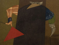 Pintura em cores no modo horizontal. No lado esquerdo o fundo é ocre, há uma figura semelhante a um braço com dois dedos e uma munhequeira azul, um dos dedos encosta a ponta em um triangulo losangulo vermelho. No centro o fundo é de cor marrom, na parte superior há figura branca e amarela semelhante a uma amarração de pano. No lado direito o fundo é de cor ocre, há uma figura semelhante a uma pata de crustáceo nas cores azul, verde e branco