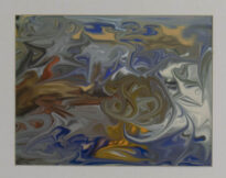 Gravura em cores no modo horizontal. Imagem mexida de suposta figura do Pato Donaldo (não é possível identificar a forma), cores predominantes em azul ,branco, amarelo, cinza e laranja