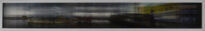 Fotografia analógica em cores apresentada no modo horizontal, possui captação de imagem em movimento com o cenário da Pedra do Peixe, em Belém-PA, tendo à esquerda da imagem um barco ancorado e à direita uma figura humana masculina em pé e um ônibus azul passando
