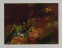 Gravura em cores no modo horizontal. Imagem mexida de suposta figura do Pluto (não é possível identificar a forma), cores predominantes em amarelo, vermelho, verde, branco, azul, marrom e laranja