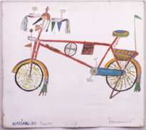 A pintura de fundo branco apresenta ao centro a representação de uma bicicleta vermelha em vista lateral. A bicicleta apresenta decoração de bandeirolas e fitas na área do guidão e na roda traseira. No canto inferior esquerdo, está assinatura do artista e à direita, a inscrição “PSICODÉLICA”.
