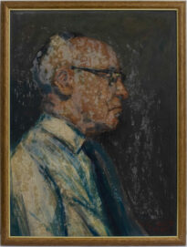 Retrato de um homem idoso de perfil, calvo de cabelos brancos, usando óculos de grau de armação escura, usando camisa de botões branca com uma gravata preta, em um fundo escuro. No lado direito inferior pode-se ler "Meu amigo e colega Pastana, lembrança" em vermelho junto da assinatura do artista e data. A pintura possui manchas mais claras, esbranquecidas por toda superfície, em um fundo de tons escuros. A moldura é dourada brilhante e fina, e o fundo da obra tem nas extremidades uma fita marrom com um pequeno texto na lateral identificando a molduraria.