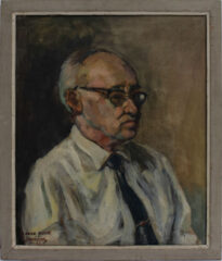 Retrato de um homem idoso de cabelos brancos, calvo no topo da cabeça, de lado usando óculos de armação escura, camisa de botões com gravata preta em um fundo de tons ocre. Na extremidade inferior esquerda pode-se ler em tinta vermelha "meu amigo Pastana", junto a assinatura do artista e data. A pintura está em uma moldura fina de cor amarelada. No verso possuí dois fios para suporte, um menor no centro superior e outro maior no meio do quadro.