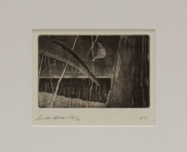 Gravura em formato retangular no sentido horizontal em tons cinza. Na gravura tem uma representação de paisagem, no canto direito há uma forma que sugere um troco de árvore e ao fundo um rio, do canto superior esquerdo projeta-se uma folhagem. Além disso, há 5 linhas brancas no sentido vertical. Observação: na parte inferior há uma incrisção em "P.E"
