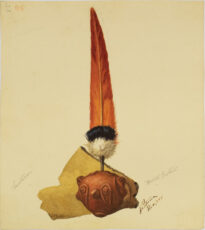 Desenho de fragmento de cerâmica arqueológica de cor amarelada com uma pena longa e vermelha, com detalhes na base em preto e branco, fixada em um aplique redondo avermelhado em forma de cabeça antropomórfica. Na extremidade esquerda o número 85 é escrito em rosa muito fraco quase desaparecendo, junto de outro número 85 na vertical em grafite. Na porção inferior na esquerda temos a palavra “Santarém” e do lado direito “Brasil Central”, com logo abaixo a assinatura, local e data da obra. No verso temos o número 85 em grafite escrito na extremidade esquerda inferior, de ponta cabeça.