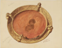 Desenho bandeja oval de fundo inferior avermelhado e duas bordas concêntricas em detalhes geométricos em amarelo ocre, com quatro apliques ligando a borda interna com a externa. No fundo central no centro da pintura, a cor avermelhada foi pintada mais forte, formando uma mancha escura Na parte superior esquerda temos “Santarém” escrito em grafite, e ainda na esquerda, na porção inferior “Brasil Central”- e “Ofertório” escritos um abaixo do outro em grafite. No lado direito temos a assinatura, local e data do artista. No verso o número “012(?)” na esquerda inferior bem pequeno, e na direita inferior o número 88.
