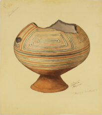 Desenho vaso arqueológico com pedestal alaranjado e bojo redondo com detalhes em linhas trapezoidais concêntricas em laranja e preto, e a borda superior se encontra quebrada. Na extremidade superior temos o número 87 em rosa quase transparente, e o mesmo número 87 na vertical em grafite. Abaixo dos números no mesmo local, “Santarém” pode ser lido, escrito em grafite. Na extremidade inferior da direita vemos a assinatura, local e data do artista, e logo abaixo “Brasil Central”. No verso, no canto superior direito o numero 87 é escrito em grafite.