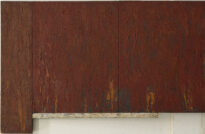 Pintura abstrata em cores no modo vertical, cores predominantes vermelho e laranja