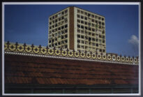Fotografia digital em cores apresentada no modo horizontal, em primeiro plano possui a visão de telhado de barro com detalhes de gradis do Mercado de Carne Francisco Bolonha, ao fundo um edifício com visão bidimensional, sobre um céu diurno sem nuvens