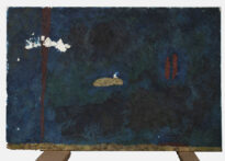 Pintura abstrata em cores no modo horizontal, possui figura branco ao centro, cores predominantes em azul e verde e aplicação de dourado e vermelho