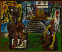 Pintura em cores no modo horizontal. A cena retrata um massacre, no centro ao fundo uma fogueira queimando os restos de um esqueleto com os pulsos presos em um espeto. No lado esquerdo há uma figura humana com expressão de desespero amarrado a uma cadeira enquanto um pássaro sobrevoa sua cabeça. No lado direito há uma figura humana vermelha, cabelos longos lisos e brancos e uma coroa de cor preta