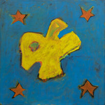 Pintura em cores. Fundo de cor azul, ao centro possui forma semelhante a de uma cruz na cor amarela com detalhes laranja e verde, rodeado por quatro estrelas de cinco pontas de cor laranja