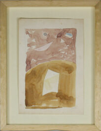 Aquarela apresentada no sentido vertical, ao centro há uma linha boleada que divide a aquarela, na parte superior há majoritariamente pinceladas em tom de violeta esmaecido com formas de um semicírculo e triângulo em tom de rosa, um círculo em tom de cinza e um formato similar há um trapézio retângulo em tom de azul. Na parte inferior à linha está preenchido majoritariamente por um tom de amarelo ocre, e ao centrol há um triângulo e em sua base um formato similar à uma bandeirola junina com duas pontas e pintada levemente em tom de amarelo