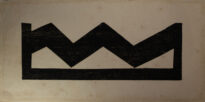 Gravura em preto e branco no modo horizontal. Forma geométrica em formato triangulo formando três amontoados na cor preta. Obs.: prova do artista