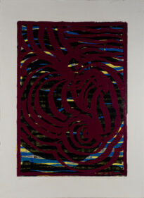 Gravura apresentada na vertical. Possui muitos elementos sobrepostos ao fundo com tonalidades de marrom, bege, preto, amarelo e azul. Nas camadas de sobreposição mais superficiais há traços na parte superior e inferior, e ao centro uma mancha generalizada, ambas em tom de preto com transparência para fundo de cor amarela; e em ultima camada de sobreposição há traços curvilíneos grossos em tom de magenta, que também se encontra no contorno da borda da gravura. Obs.: Tiragem 2/2.