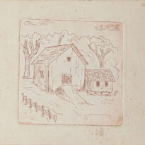 Duas casas com árvores ao fundo, uma cerca do lado esquerdo e uma rampa na entrada da casa do lado esquerdo (sugere palafitas). Obs.: Tiragem 4/25. No verso há a inscrição "MEP 99/01.3/0014-BC".