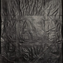 Pintura quadrada, há duas linhas na vertical e duas na horizontal que formam um desenho semelhante ao gride. Também há linhas na diagonal que formam uma figura semelhante a um losango. Há tinta preta por toda a superficie do papel, sendo as linhas mais provavelmente por conta do grafite