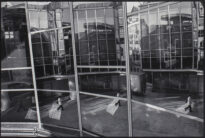 Fotografia em preto e branco no modo horizontal de quatro painéis de vidro de janelas reflexivas, com imagens da vista de uma fachada de um prédio envidraçado e uma rua/calçada ou passeio onde uma pessoa usando roupa branca e calças pretas caminha. A fotografia foi feita em Paris, França
