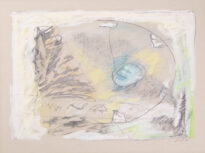A pintura exibe ao centro, uma forma circular irregular, delineada por linhas finas e escuras, com tonalidades internas de amarelo e cinza. Dentro dessa forma, destaca-se uma área arredondada azul mais intensa, com linhas concêntricas ao redor. À esquerda, há traços diagonais e sobrepostos em marrom e cinza, formando uma estrutura triangular. Perto da base, há pequenos desenhos lineares que lembram figuras de quatro patas. Nas extremidades, manchas e linhas em tons de verde, branco e preto.