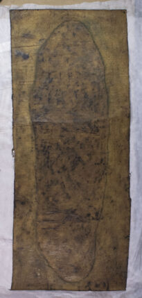 Pintura em cores no modo vertical, possui forma orgânica sinuosa. Possui tonalidades que vão do ocre, marrom e preto