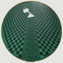 Obra em suporte circular possui tiras plásticas transpassadas apresentando quadriculados nas cores preto e verde, que formam ao centro da obra uma imagem de um regador na cor branca que derrama água. Obs.: obra fez parte do XVI Salão Nacional de Artes Plásticas