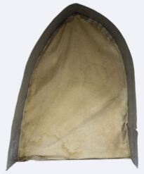Escultura em formato de arco ogival, fundo de tecido branco amarelado