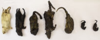 Um rato branco empalhado, dois ratos empalhados mergulhados em placas de encáustica, seis ratos fundidos em bronze em diferentes tamanhos, quatro estantes de madeiras pintadas de branco e um texto plastificado