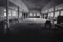Fotografia em preto e branco no modo horizontal. Grande ala hospitalar vazia abandonada, com muitas janelas e colunas e no centro e no fundo, uma porta central e em cada canto pequenas cabines de paredes escuras. Nas laterais no salão há camas e mesinhas de apoio com uma gaveta. Na direita inferior existem armários, mesas e cadeiras de rodas. A foto feita em Fordlândia, Pará