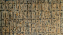 Pintura abstrata no modo horizontal, possui figuras que formam formas geométricas, cores predominantes são laranja, azul, amarelo e preto