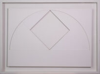 Obra apresentada na horizontal de cor branca, formada por figuras geométricas e sobrepostas de meia lua e losango. Obs.: obra participou do 11º Salão Nacional de Artes Plásticas