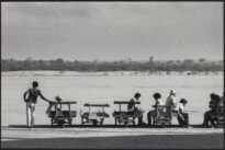 Fotografia em preto e branco no modo horizontal de uma paisagem com o fundo sendo a vista de uma margem de rio no horizonte. No primeiro plano há cinco carrinhos de mão e seis figuras humanas, uma no lado esquerdo que está encostada no carrinho e outra de chapéu branco sentada, um carrinho sem vazio, um carrinho com uma pessoa sentada virada para a direita, um carrinho com três pessoas sentadas, uma delas usa chapéu, e no canto direito parte de um carrinho com mais duas sentadas viradas para a esquerda. A fotografia feita em Marabá, Pará