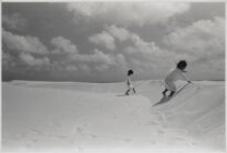 Fotografia em preto e branco no modo horizontal, com plano de fundo sendo nuvens espalhadas pelo céu e paisagem de areia de praia com uma pequena duna do lado direito da foto. Há duas figuras humanas masculinas infantis com corte de cabelo curto e trajando vestes brancas longas, elas estão de costas escalando uma duna, a mais distante somente com um pé na duna e a outra com os dois pés e usando as mãos para subir, com a mão direita na areia.
