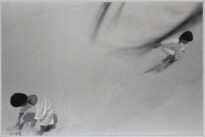 Fotografia em preto e banco no modo horizontal com a perspectiva vista de cima, com o fundo de chão de areia, há duas figuras humanas masculinas infantis abaixadas mexendo na areia uma de costas para a outra, em cantos opostos da imagem, ambas possuem corte de cabelo cuia e trajam camisa branca longa. A criança do canto inferior esquerdo está abaixada tocando na areia com as mãos, enquanto a criança do canto superior direito está com a mão esquerda na areia, subindo uma duna. Na parte superior existem duas sombras finas longas, provavelmente de palmeira.