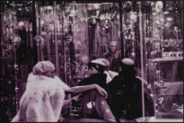 Fotografia em cores rosadas monocromáticas no modo horizontal. Fundo de loja portas de vidro, lustres, e objetos reflexivos redondos pendurados. Há roupas e manequins refletidos. No centro em destaque há duas figuras humanas femininas refletidas no espelho do vidro, elas usam roupas de frio como casaco de pelo, boina, touca e cachecol.A foto foi feita na França