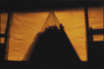 Fotografia em cores no modo horizontal. Fundo de cor laranja, no centro há silhueta de uma rede. observações: fotografia feita em Santarém, Pará