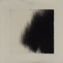 Gravura em preto e branco quadrada. Fundo de cor branca, no lado direito há uma concetração de riscas pretas formando uma figura ponteada para a esquerda. Na parte inferior direita há a assinatura do artista e ano "armando sobral, 1992"