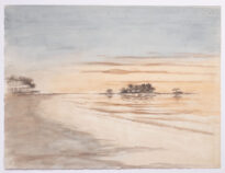 Descrição referente a frente da pintura que retrata uma paisagem litorânea. Na parte superior, o céu ocupa quase metade da obra, em tonalidades azuladas e acinzentadas que se misturam a faixas horizontais em laranja claro e bege, sugerindo o momento do nascer do Sol ou do pôr do Sol. No centro, um conjunto de árvores escuras aparece no horizonte, refletindo-se de forma difusa sobre a água. À esquerda, mais distante, nota-se um agrupamento menor de árvores em marrom escuro, próximo à margem. A parte inferior à esquerda é ocupada pela faixa de areia com água à direita, em tons claros de bege e marrom, com pinceladas horizontais que sugerem movimento suave das águas. A assinatura da artista está visível no canto inferior direito.