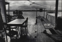 Fotografia em preto e branco no modo horizontal. Fundo de paisagem de rio com vegetação. Vista da beira de um trapiche de madeira, no lado esquedo há mesa e cadeira e mais no canto inferior há garrafas, ao fundo uma construção não identificada no rio, no lado direito inferior há uma corrente, e mais ao canto direito uma embarcação coberta por lona. Se assemelha a um restaurante da ilha do combu. Observações: fotografia feita em Itaituba, Pará