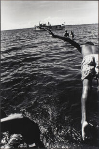 Fotografia em preto e branco no modo vertical. Fundo de paisagem de rio, ao fundo centralizado há embarcação de cor branca. No lado direito há figura humana masculina mergulhando de costas, no lado esquerdo figura humana sentada na água. Observações: foto feita em Santarém, Pará