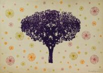 Gravura em cores no modo vertical. Fundo de coloração branca, possui a figura de uma árvore na cor preta, com várias figuras coloridas orgânicas ao redor, coloração predominante em laranja, vermelho e verde