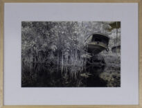 Fotografia digital em preto e branco de formato retangular e apresentada no modo horizontal. Em um ambiente de beira de rio, ao lado esquerdo da imagem há uma densa vegetação arbórea com raízes expostas. Na margem direita da imagem possui um barco com posição elevada em relação ao rio estando parte dele apoiado em terra, e mais ao fundo em relação ao barco, ainda na margem direita da imagem, nota-se uma casa de madeira.