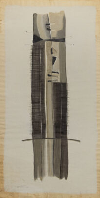 Pintura em cores no modo vertical, fundo branco e ao centro possui figura formada por variadas tonalidades de preto, cinza, branco e bege, formando figuras geometricas retangulares e triangulares